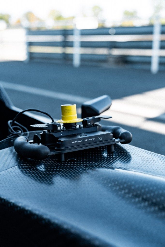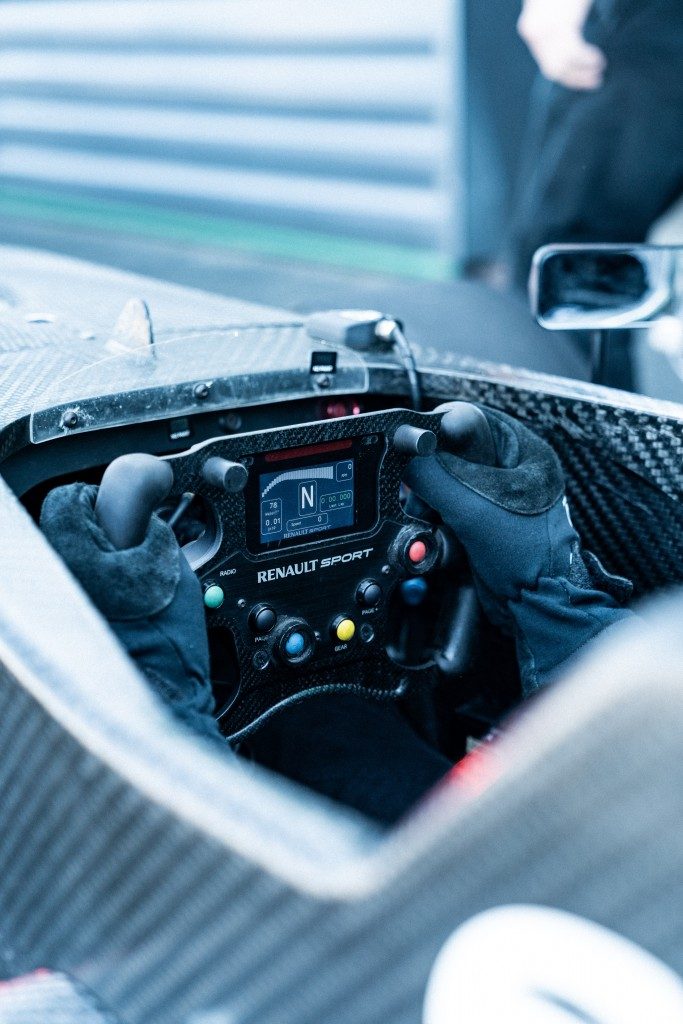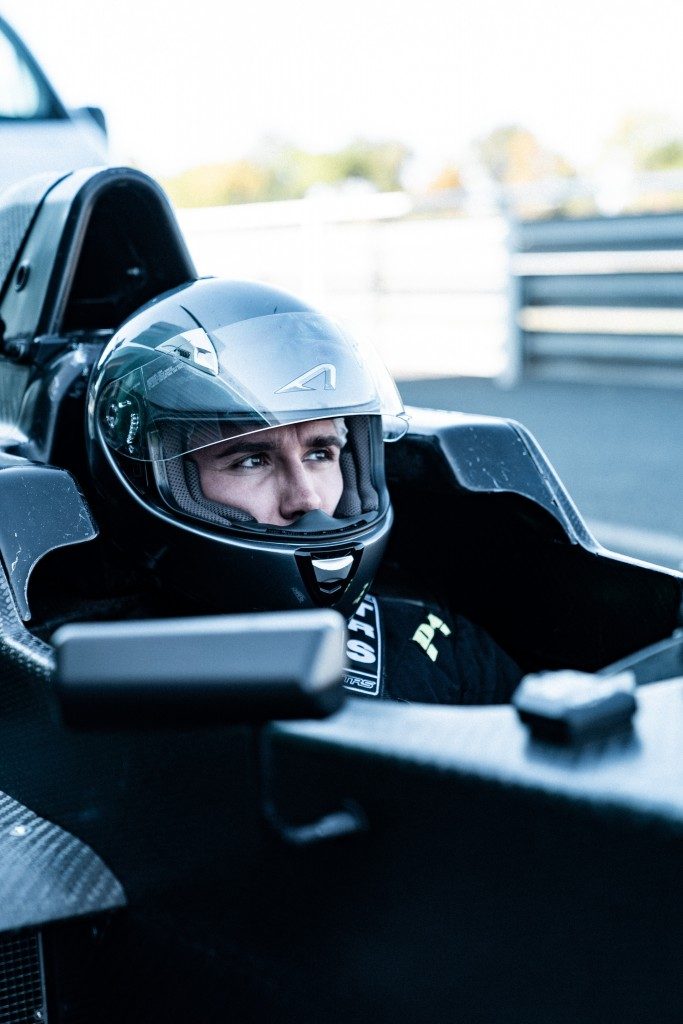 Je prends enfin place dans le baquet pour la première fois et à peine dedans on ressent déjà une sensation incroyable. Mes jambes sont serrées contre l’ossature de la voiture, on a l’impression d’être assis sur le sol, on voit nos roues avant à la perfection et il ne reste que ma tête qui dépasse de l’habitacle. Après avoir serré les sangles de sécurité pour être sûr de ne pas bouger vient le moment où l’on vient emboiter le volant dans l’arbre de direction. Je me retrouve avec un vrai volant de monoplace en face des yeux et dans les mains !